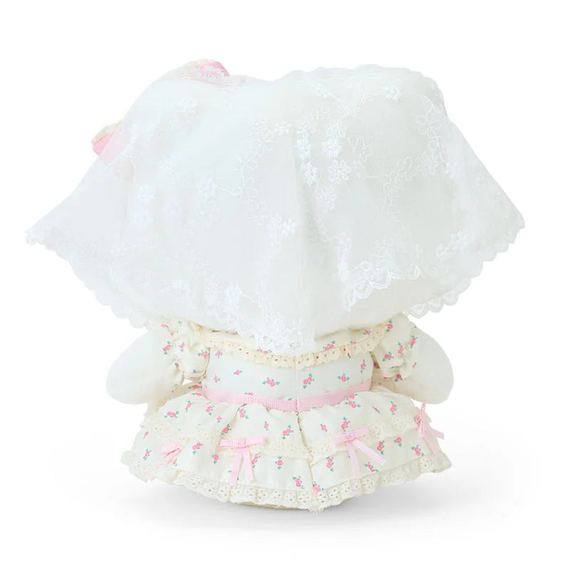 A cute plush toy with a babushka on his head and a spring-like lace & floral costume.
